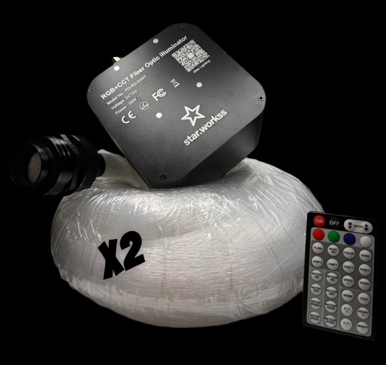 Light up your space with a premium starlight effect. This kit comes with 17 feet of durable 0.5mm fiber optic cable, paired with a powerful 30W twinkle motor light source that creates a sparkling night-sky effect. Built for reliability and brightness, it’s perfect for custom car headliners, home décor, or any creative lighting project.